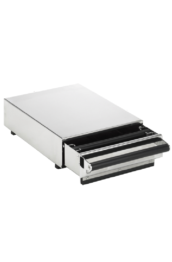 Tiroir Exclusive S. Knock box à tiroir refermable, aramture en inox avec poignée et finitions en caoutchouc, à placer sous le moulin à café.