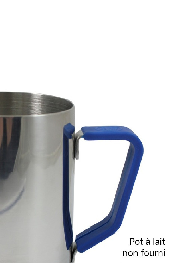 Poignée en silicone bleu antidérapant pour pots à lait 20oz/590ml pour aider le barista à différencier les types de lait dans les pots.
