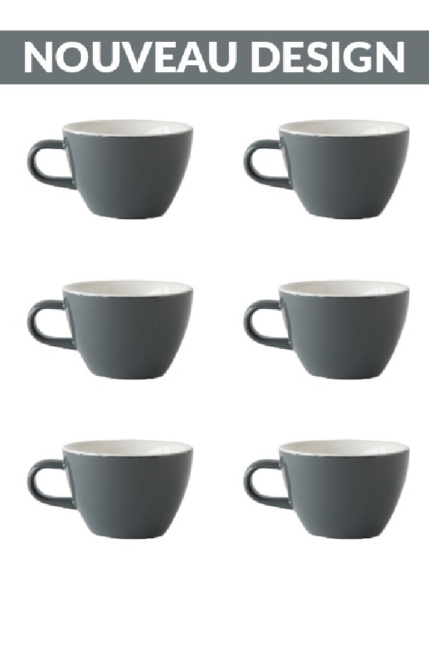 Set x 6 tasses en porcelaine coloris gris avec anse de 150ml. Idéal pour un espresso et double espresso avec du lait ou de la mousse de lait (flat white. macchiato, con pana, etc.) ou encore un café filtre. Vendu par carton de 6 tasses.