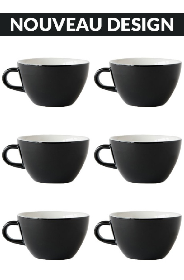 Set x 6 tasses en porcelaine coloris noir avec anse de 280ml. Idéal pour les cappuccino, les latte ou les chocolats chauds. Vendu par carton de 6 tasses.